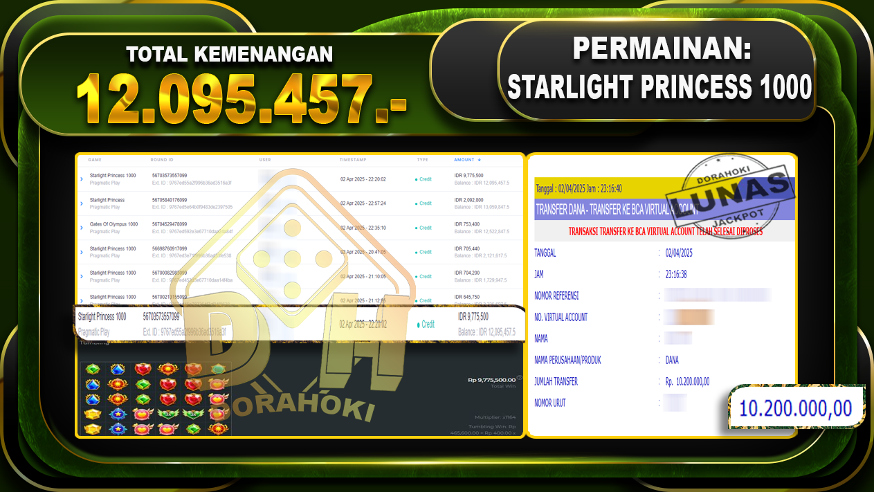Bukti JP STARLIGHT PRINCESS 1000 – ucapkan selamat kepada user id Lanxxx atas kemenangan di STARLIGHT PRINCESS 1000 dengan total kemenangan Rp.12,095.457,- . Yang pasti nya langsung LUNAS sesuai bukti ya bosku. Dorahoki nih bosku berapapun akan tetap kami bayar lunas ya bosku
