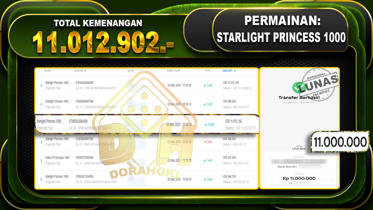 Bukti JP STARLIGHT PRINCESS 1000 – ucapkan selamat kepada user id Alixxx atas kemenangan di STARLIGHT PRINCESS 1000 dengan total kemenangan Rp.11.012.902,- . Yang pasti nya langsung LUNAS sesuai bukti ya bosku. Dorahoki nih bosku berapapun akan tetap kami bayar lunas ya bosku