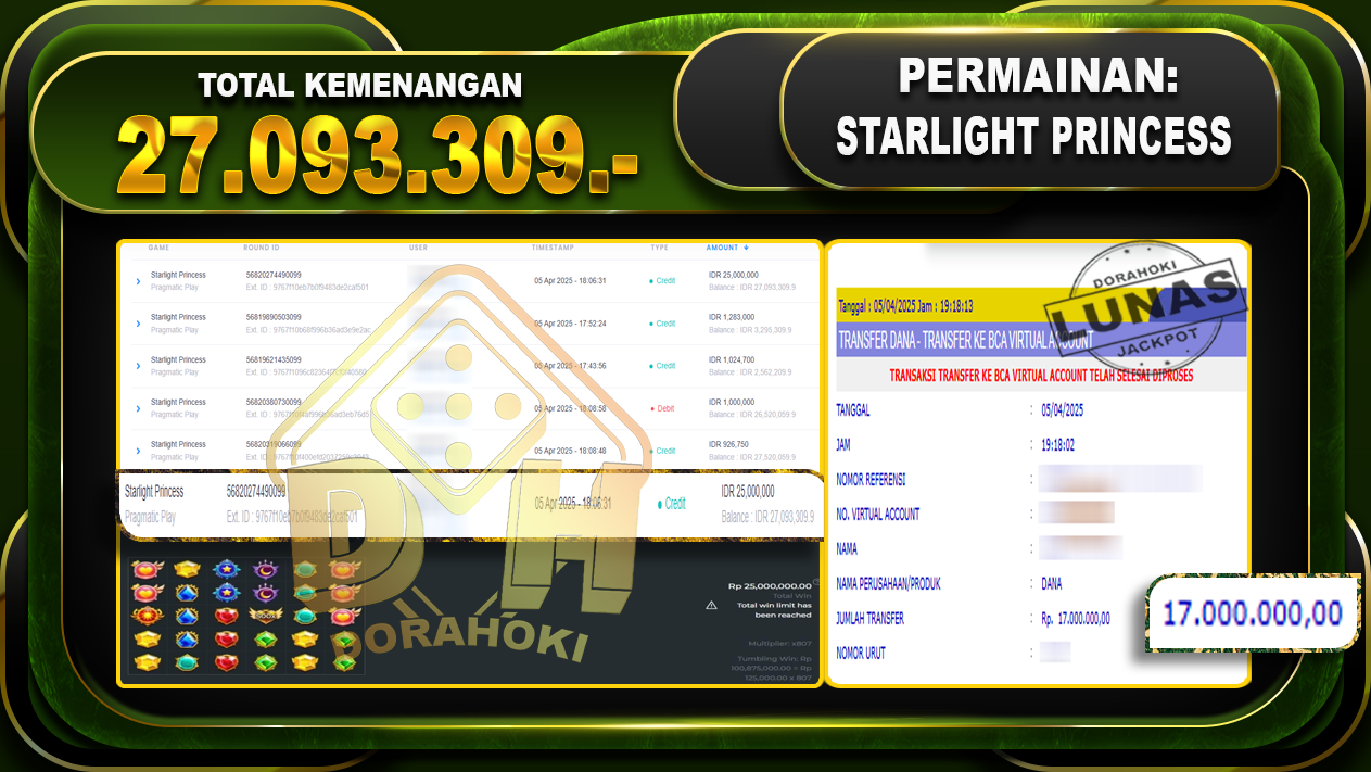 Bukti JP STARLIGHT PRINCESS 1000 – ucapkan selamat kepada user id Apixxx atas kemenangan di  STARLIGHT PRINCESS 1000  dengan total kemenangan Rp.27,093.309,- . Yang pasti nya langsung LUNAS sesuai bukti ya bosku. Dorahoki nih bosku berapapun akan tetap kami bayar lunas ya bosku