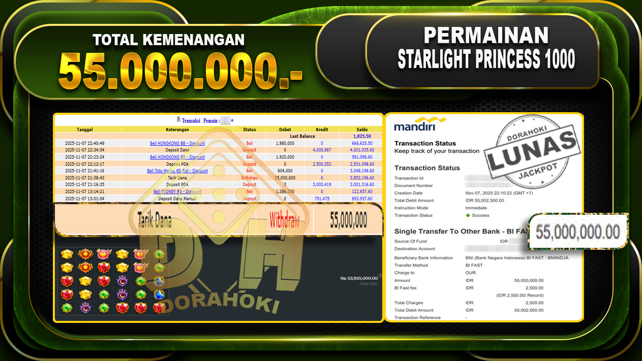 Bukti JP Starlight Princess 1000 – ucapkan selamat kepada user id jitxx atas kemenangan di Starlight Princess 1000 dengan total kemenangan Rp.55,000,000,- Yang pasti nya langsung LUNAS sesuai bukti ya bosku. Dorahoki nih bosku berapapun akan tetap kami bayar lunas ya bosku