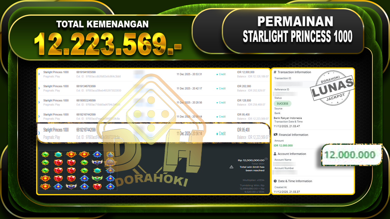 Bukti JP Starlight Princess 1000 – ucapkan selamat kepada user id selxxxxx atas kemenangan di Starlight Princess 1000 dengan total kemenangan Rp.12,223.569,- Yang pasti nya langsung LUNAS sesuai bukti ya bosku. Dorahoki nih bosku berapapun akan tetap kami bayar lunas ya bosku