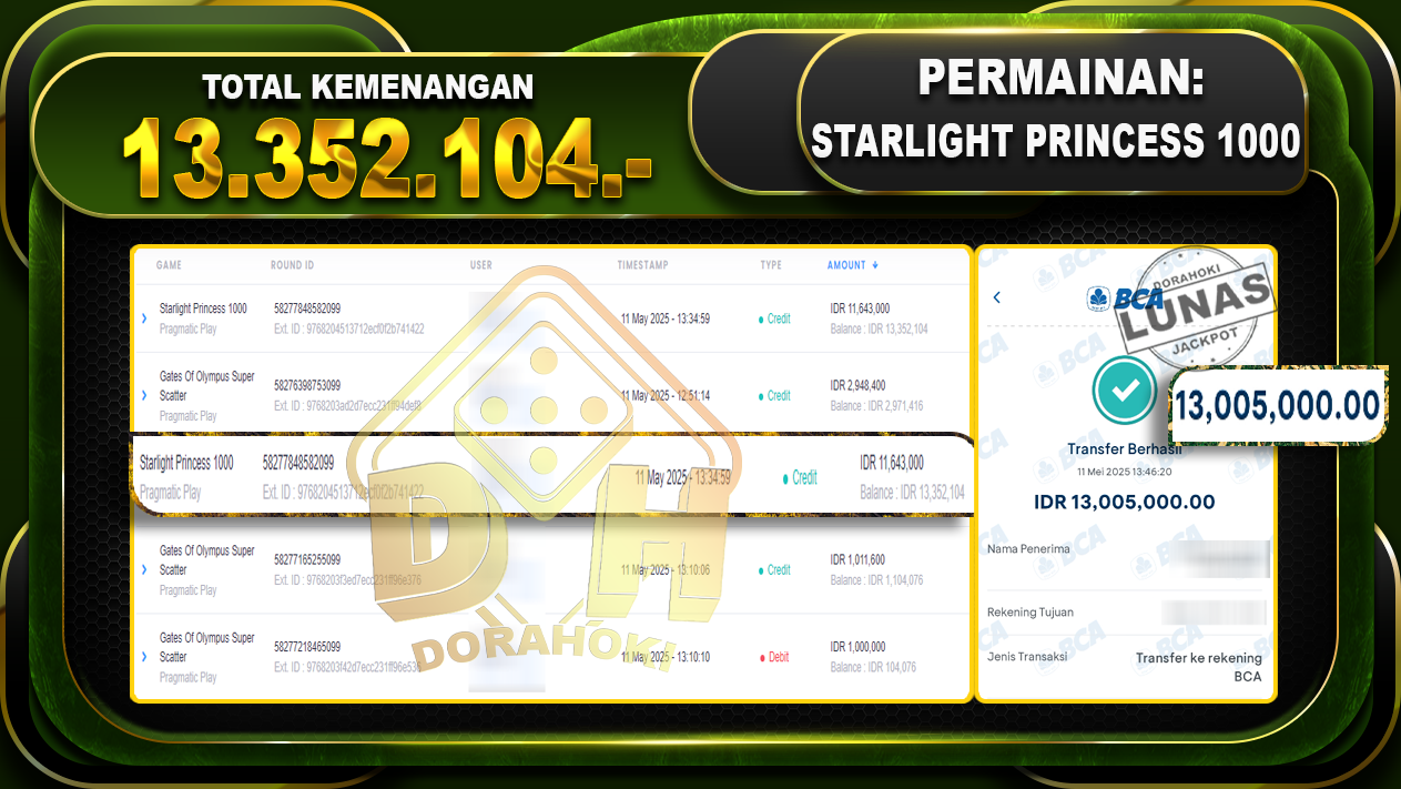 Bukti JP STARLIGHT PRINCESS 1000 – ucapkan selamat kepada user id Dinxxx atas kemenangan di STARLIGHT PRINCESS 1000 dengan total kemenangan Rp.13.352.104,- . Yang pasti nya langsung LUNAS sesuai bukti ya bosku. Dorahoki nih bosku berapapun akan tetap kami bayar lunas ya bosku