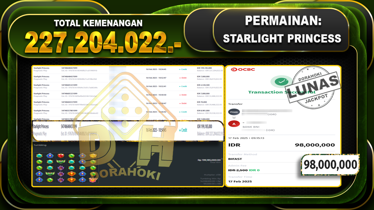 Bukti JP STARLIGHT PRINCESS 1000 – ucapkan selamat kepada user id LOxxx atas kemenangan di STARLIGHT PRINCESS 1000 dengan total kemenangan Rp.227,204.022,- . Yang pasti nya langsung LUNAS sesuai bukti ya bosku. Dorahoki nih bosku berapapun akan tetap kami bayar lunas ya bosku.