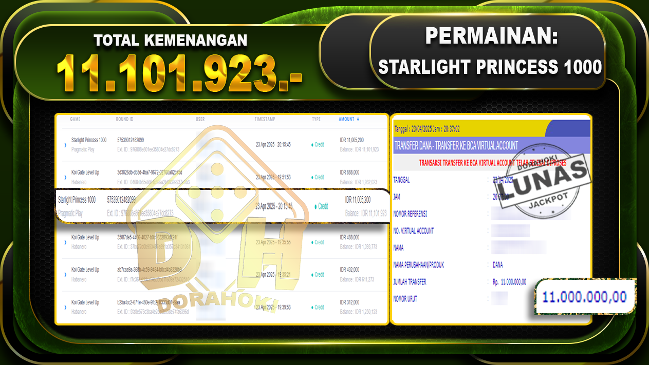 Bukti JP STARLIGHT PRINCESS 1000 – ucapkan selamat kepada user id Fikxxx atas kemenangan di STARLIGHT PRINCESS 1000 dengan total kemenangan Rp.11,101.923,- . Yang pasti nya langsung LUNAS sesuai bukti ya bosku. Dorahoki nih bosku berapapun akan tetap kami bayar lunas ya bosku