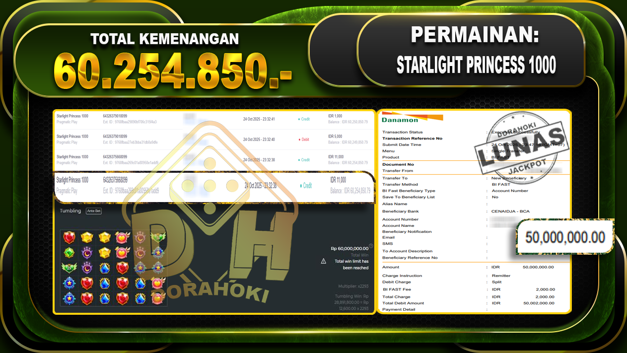 Bukti JP Starlight Princess 1000 – ucapkan selamat kepada user id zhaxxxx atas kemenangan di Starlight Princess 1000 dengan total kemenangan Rp.60,254,850,- Yang pasti nya langsung LUNAS sesuai bukti ya bosku. Dorahoki nih bosku berapapun akan tetap kami bayar lunas ya bosku