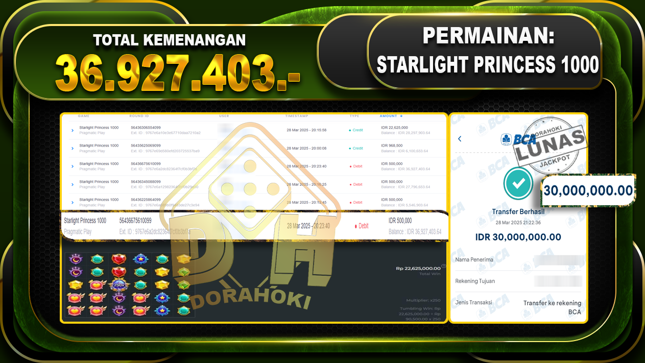 Bukti JP STARLIGHT PRINCESS 1000 – ucapkan selamat kepada user id Gapxxx atas kemenangan di STARLIGHT PRINCESS 1000 dengan total kemenangan Rp.36,927.403,- . Yang pasti nya langsung LUNAS sesuai bukti ya bosku. Dorahoki nih bosku berapapun akan tetap kami bayar lunas ya bosku