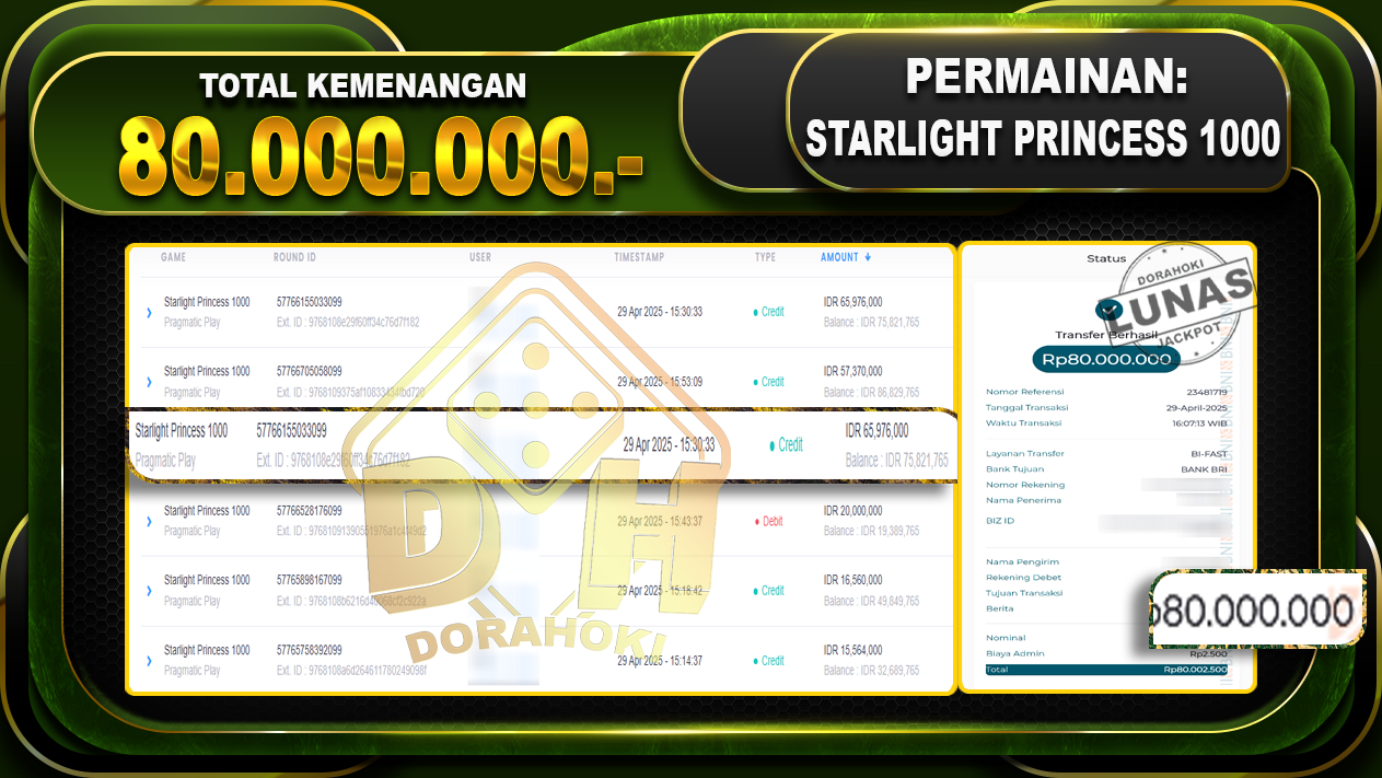 Bukti JP STARLIGHT PRINCESS 1000 – ucapkan selamat kepada user id Prixxx atas kemenangan di STARLIGHT PRINCESS 1000 dengan total kemenangan Rp.80.000.000,- . Yang pasti nya langsung LUNAS sesuai bukti ya bosku. Dorahoki nih bosku berapapun akan tetap kami bayar lunas ya bosku