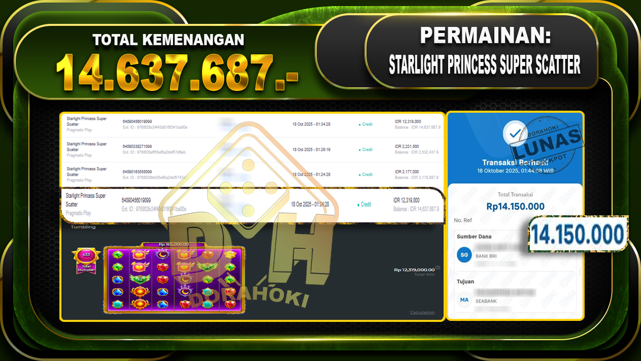Bukti JP Starlight Princess super scatter – ucapkan selamat kepada user id hokxxxxx atas kemenangan di Starlight Princess super scatter dengan total kemenangan Rp.14,637,687,- Yang pasti nya langsung LUNAS sesuai bukti ya bosku. Dorahoki nih bosku berapapun akan tetap kami bayar lunas ya bosku