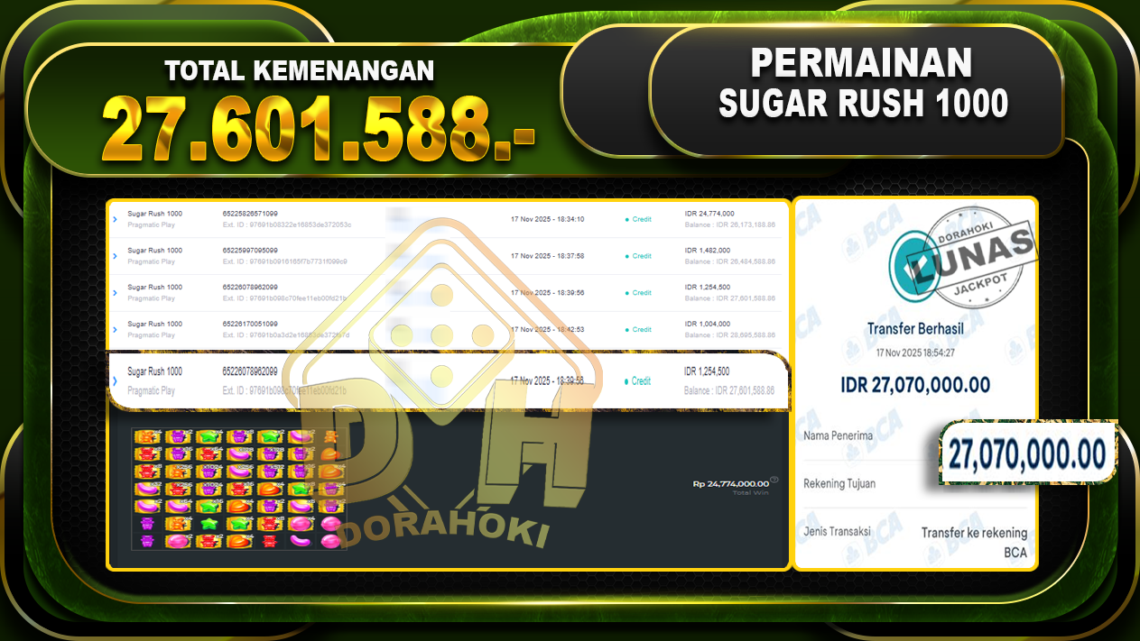 Bukti JP Sugar Rush 1000 – ucapkan selamat kepada user id bawxx atas kemenangan di  Sugar Rush 1000 dengan total kemenangan Rp.27,601,588,- Yang pasti nya langsung LUNAS sesuai bukti ya bosku. Dorahoki nih bosku berapapun akan tetap kami bayar lunas ya bosku