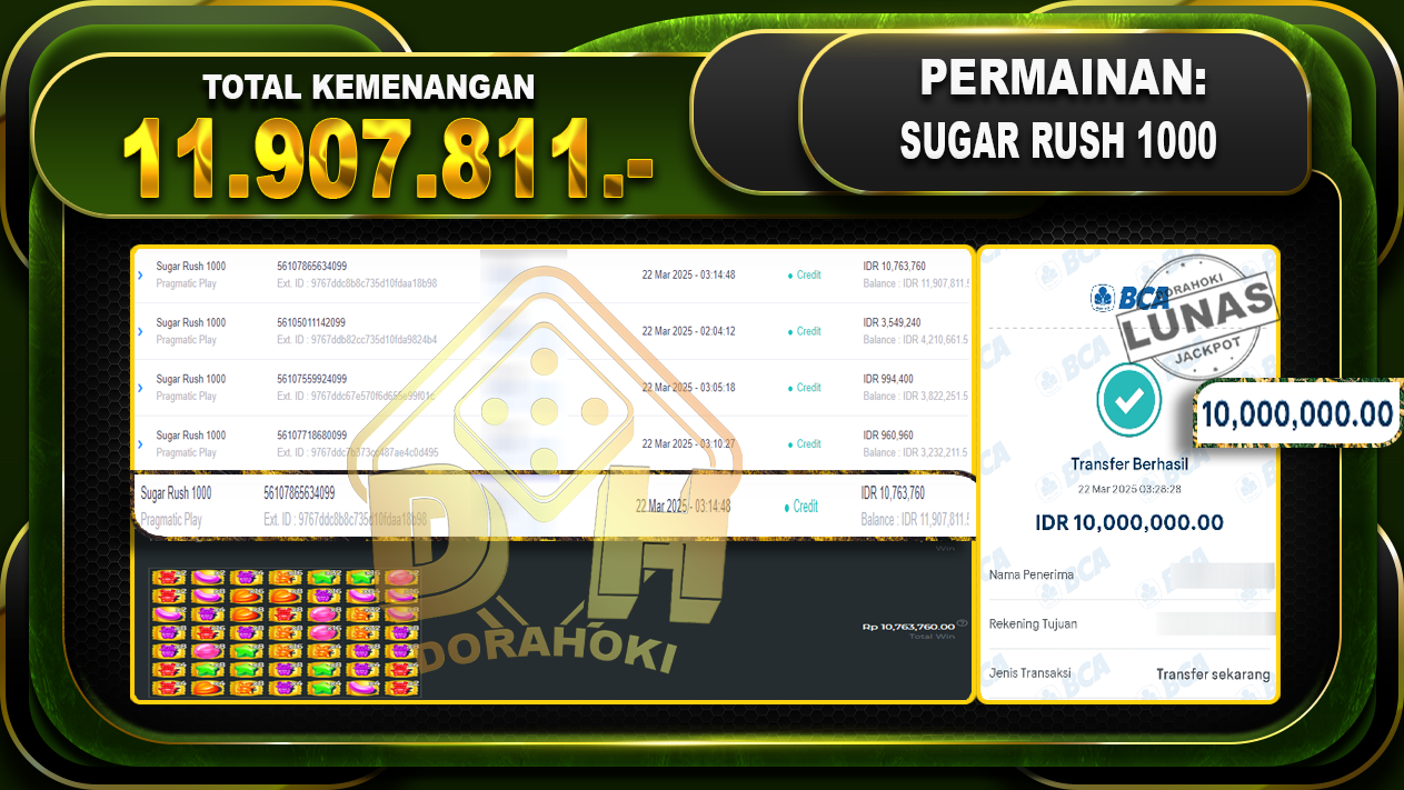 Bukti JP SUGAR RUSH 1000 – ucapkan selamat kepada user id Bonxxx atas kemenangan di SUGAR RUSH 1000 dengan total kemenangan Rp.11.907.811,- . Yang pasti nya langsung LUNAS sesuai bukti ya bosku. Dorahoki nih bosku berapapun akan tetap kami bayar lunas ya bosku.