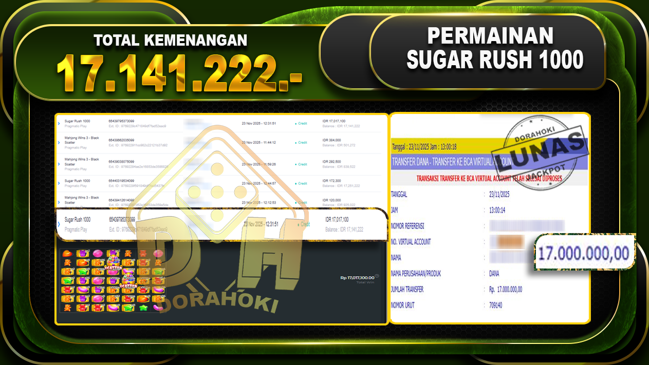 Bukti JP Sugar Rush 1000 – ucapkan selamat kepada user id popxxxxx atas kemenangan di Sugar Rush 1000 dengan total kemenangan Rp.17,141,222,- Yang pasti nya langsung LUNAS sesuai bukti ya bosku. Dorahoki nih bosku berapapun akan tetap kami bayar lunas ya bosku