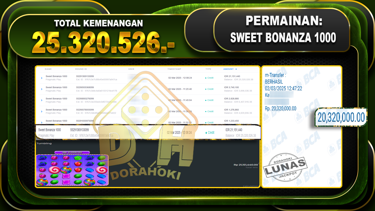 Bukti JP SWEET BONANZA 1000 – ucapkan selamat kepada user id Dulxxx atas kemenangan di SWEET BONANZA 1000 dengan total kemenangan Rp25.320.526,- . Yang pasti nya langsung LUNAS sesuai bukti ya bosku. Dorahoki nih bosku berapapun akan tetap kami bayar lunas ya bosku.