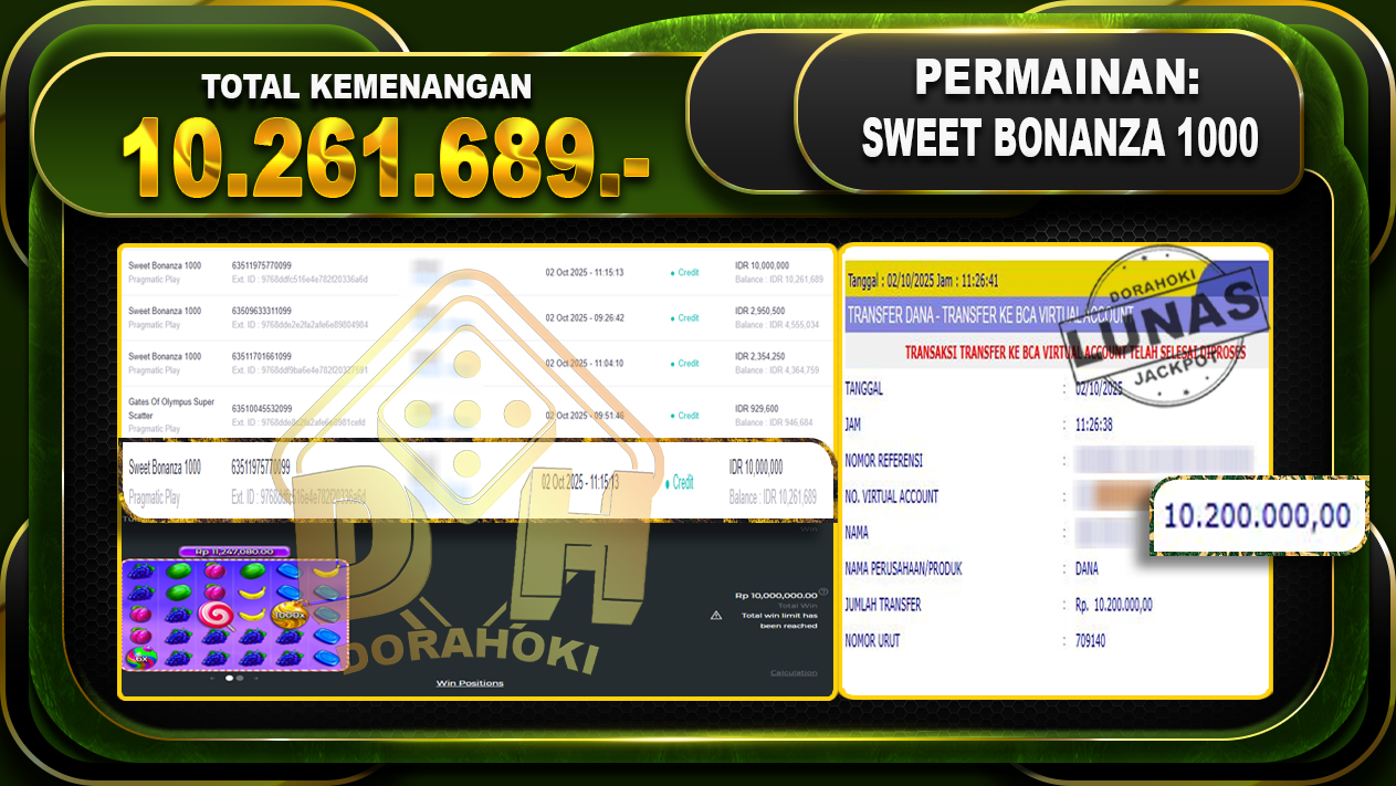 Bukti JP Sweet Bonanza 1000 – ucapkan selamat kepada user id udixxxxx atas kemenangan di Sweet Bonanza 1000 dengan total kemenangan Rp.10,261,689,- Yang pasti nya langsung LUNAS sesuai bukti ya bosku. Dorahoki nih bosku berapapun akan tetap kami bayar lunas ya bosku