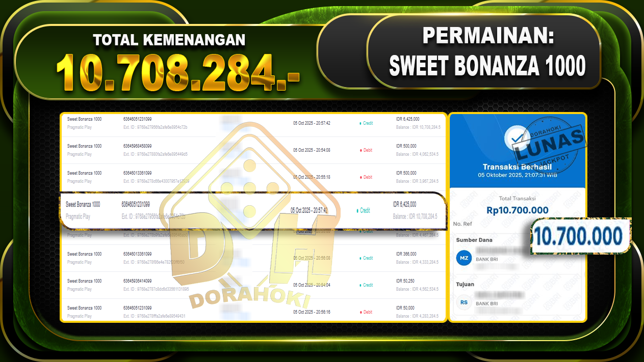 Bukti JP Sweet Bonanza 1000 – ucapkan selamat kepada user id praxxxxxx atas kemenangan di Sweet Bonanza 1000 dengan total kemenangan Rp.10,708,284,- Yang pasti nya langsung LUNAS sesuai bukti ya bosku. Dorahoki nih bosku berapapun akan tetap kami bayar lunas ya bosku