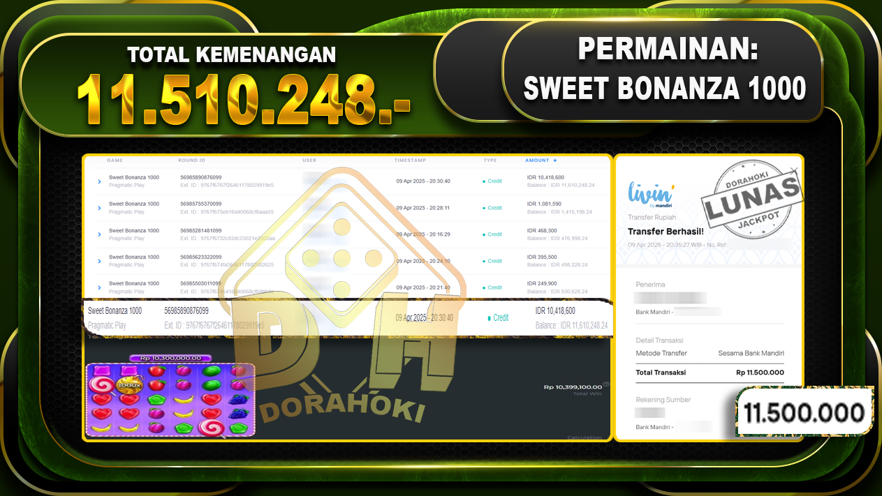 Bukti JP SWEET BONANZA 1000 – ucapkan selamat kepada user id Leaxxx atas kemenangan di SWEET BONANZA 1000 dengan total kemenangan Rp11.510.248,- . Yang pasti nya langsung LUNAS sesuai bukti ya bosku. Dorahoki nih bosku berapapun akan tetap kami bayar lunas ya bosku.