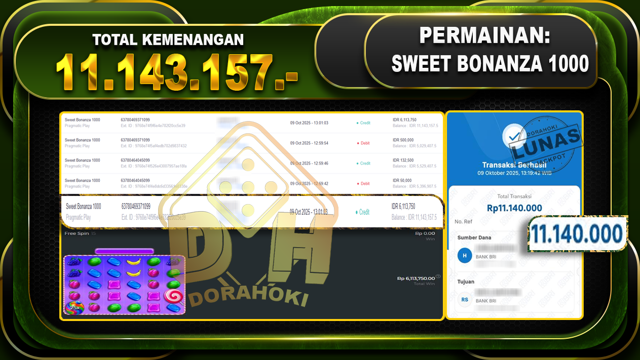 Bukti JP Sweet Bonanza 1000 – ucapkan selamat kepada user id praxxxxxx atas kemenangan di Sweet Bonanza 1000 dengan total kemenangan Rp.11,143,157,- Yang pasti nya langsung LUNAS sesuai bukti ya bosku. Dorahoki nih bosku berapapun akan tetap kami bayar lunas ya bosku