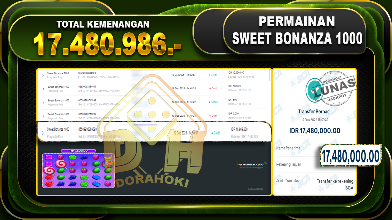 Bukti JP Sweet Bonanza 1000 – ucapkan selamat kepada user id pamxxxxx atas kemenangan di Sweet Bonanza 1000 dengan total kemenangan Rp.17.480.986,- Yang pasti nya langsung LUNAS sesuai bukti ya bosku. Dorahoki nih bosku berapapun akan tetap kami bayar lunas ya bosku.