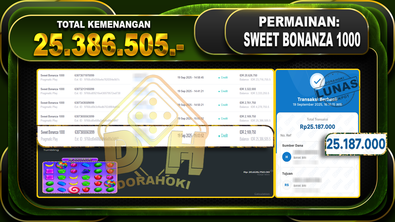 Bukti JP Sweet Bonanza 1000 – ucapkan selamat kepada user id Praxxxxxx atas kemenangan di Sweet Bonanza 1000 dengan total kemenangan Rp.25,386,505,- Yang pasti nya langsung LUNAS sesuai bukti ya bosku. Dorahoki nih bosku berapapun akan tetap kami bayar lunas ya bosku