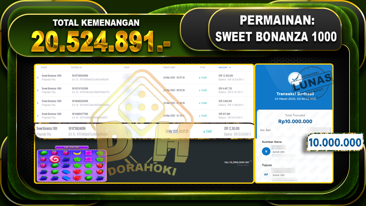 Bukti JP SWEET BONANZA 1000 – ucapkan selamat kepada user id Vzoxxx atas kemenangan di SWEET BONANZA 1000 dengan total kemenangan Rp20.524.891,- . Yang pasti nya langsung LUNAS sesuai bukti ya bosku. Dorahoki nih bosku berapapun akan tetap kami bayar lunas ya bosku.