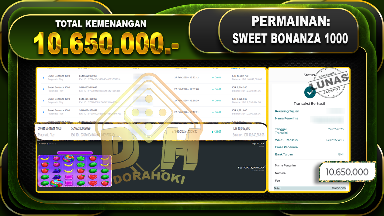 Bukti JP SWEET BONANZA 1000 – ucapkan selamat kepada user id Nhixxx atas kemenangan di SWEET BONANZA 1000 dengan total kemenangan Rp.10.650.000,- . Yang pasti nya langsung LUNAS sesuai bukti ya bosku. Dorahoki nih bosku berapapun akan tetap kami bayar lunas ya bosku.