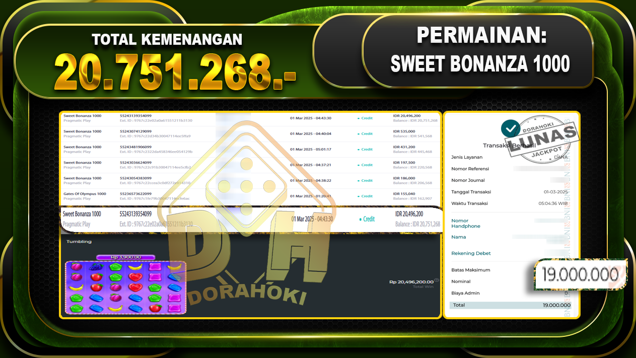 Bukti JP SWEET BONANZA 1000 – ucapkan selamat kepada user id Bwsxxx atas kemenangan di  SWEET BONANZA 1000 dengan total kemenangan Rp.20.751.268,- . Yang pasti nya langsung LUNAS sesuai bukti ya bosku. Dorahoki nih bosku berapapun akan tetap kami bayar lunas ya bosku.