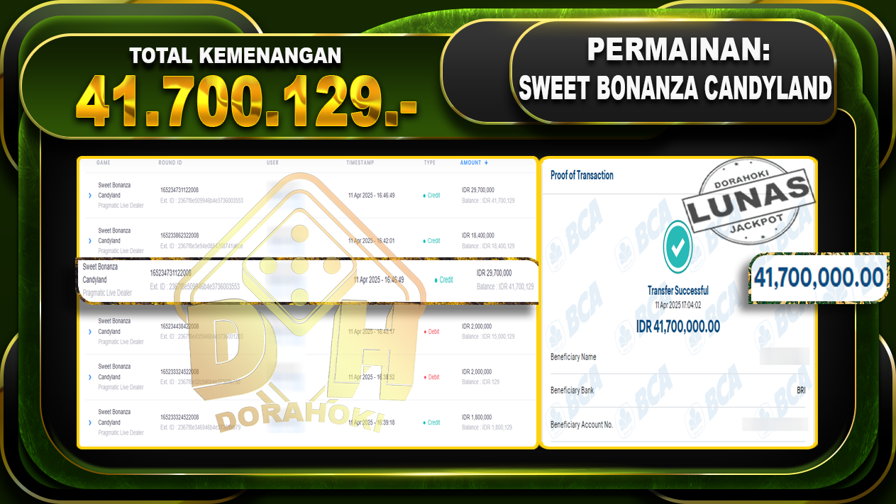 Bukti JP SWEET BONANZA CANDYLAND – ucapkan selamat kepada user id Adexxx atas kemenangan di SWEET BONANZA CANDYLAND dengan total kemenangan Rp.41.700.129,- . Yang pasti nya langsung LUNAS sesuai bukti ya bosku. Dorahoki nih bosku berapapun akan tetap kami bayar lunas ya bosku.