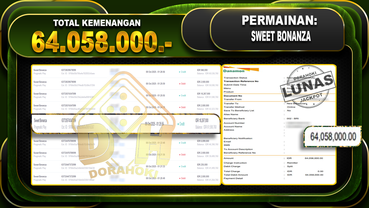 Bukti JP Sweet Bonanza – ucapkan selamat kepada user id yahxxxxx atas kemenangan di  Sweet Bonanza dengan total kemenangan Rp.64.058.000,- Yang pasti nya langsung LUNAS sesuai bukti ya bosku. Dorahoki nih bosku berapapun akan tetap kami bayar lunas ya bosku