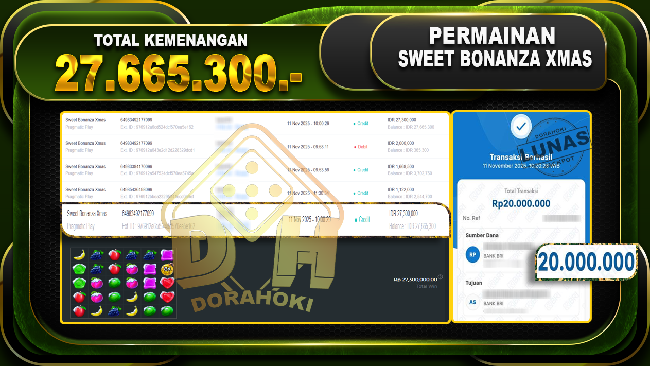 Bukti JP Sweet Bonanza Xmas – ucapkan selamat kepada user id kakxxxx atas kemenangan di Sweet Bonanza dengan total kemenangan Rp.27.665.333,- . Yang pasti nya langsung LUNAS sesuai bukti ya bosku. Dorahoki nih bosku berapapun akan tetap kami bayar lunas ya bosku.