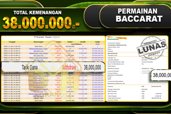 Bukti JP BACCARAT – ucapkan selamat kepada user id olsxxx atas kemenangan di BACCARAT dengan total kemenangan Rp.38.000.000,- . Yang pasti nya langsung LUNAS sesuai bukti ya bosku. Dorahoki nih bosku berapapun akan tetap kami bayar lunas ya bosku.