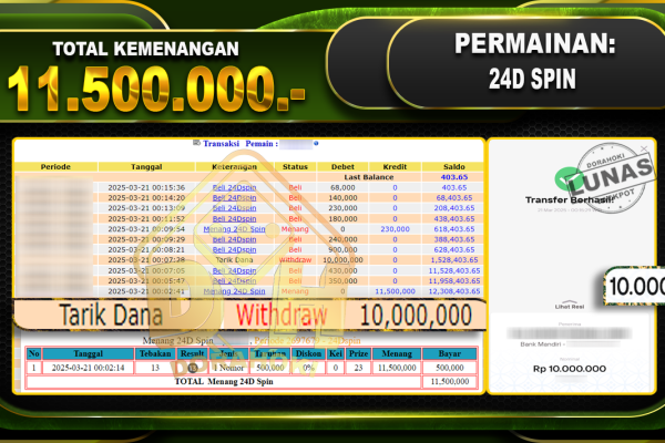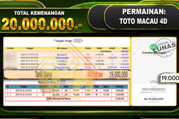 Bukti JP TOGEL TOTOMACAU 4D – ucapkan selamat kepada user id Omaxxx atas kemenangan di TOGEL TOTOMACAU 4D dengan total kemenangan Rp.20.000.000,- . Yang pasti nya langsung LUNAS sesuai bukti ya bosku. Dorahoki nih bosku berapapun akan tetap kami bayar lunas ya bosku. Kami mengucapkan Terima Kasih telah mempercayakan DORAHOKI sebagai Bandar Online pilihan dalam…