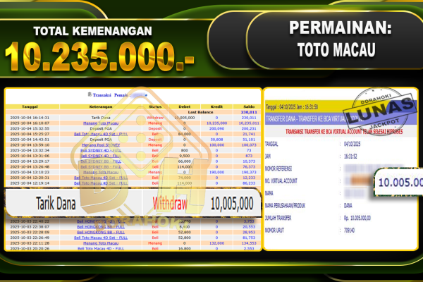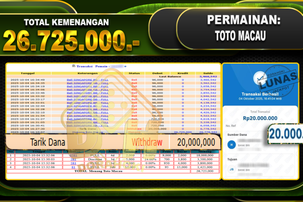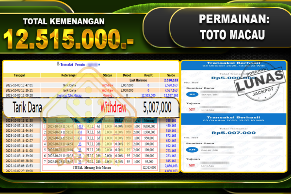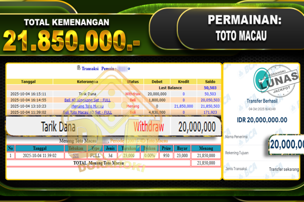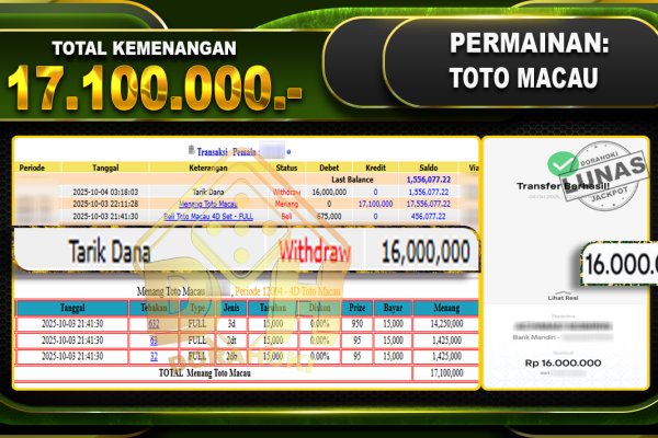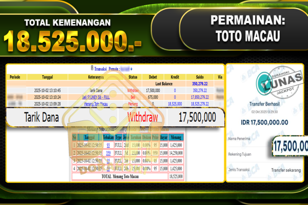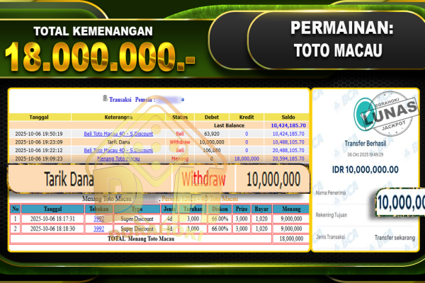 Bukti JP TOGEL TOTO MACAU – ucapkan selamat kepada user id mimxxxxx atas kemenangan di TOGEL TOTO MACAU dengan total kemenangan Rp.18,000,000,- Yang pasti nya langsung LUNAS sesuai bukti ya bosku. Dorahoki nih bosku berapapun akan tetap kami bayar lunas ya bosku