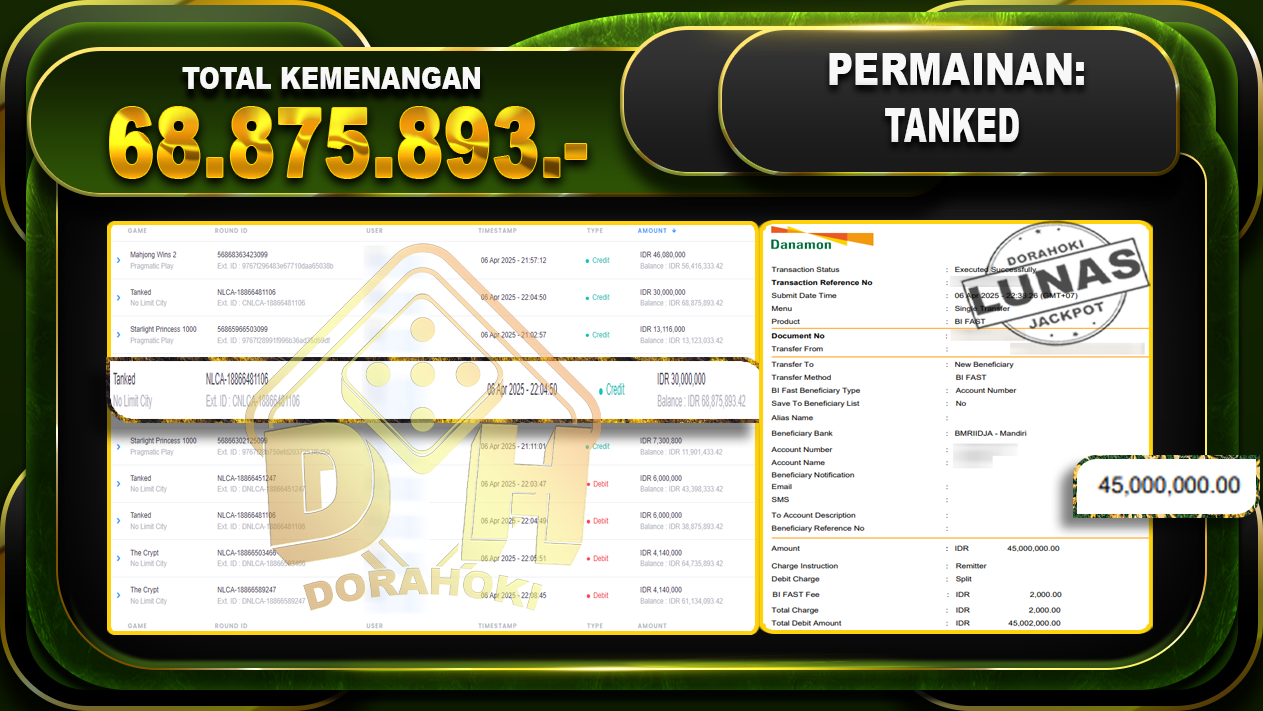 Bukti JP Tanked – ucapkan selamat kepada user id Jitxxx atas kemenangan di Tanked dengan total kemenangan Rp.68.875.893,- . Yang pasti nya langsung LUNAS sesuai bukti ya bosku. Dorahoki nih bosku berapapun akan tetap kami bayar lunas ya bosku.