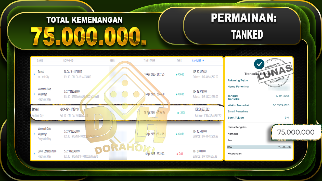 Bukti JP Tanked – ucapkan selamat kepada user id Jitxxx atas kemenangan di Tanked dengan total kemenangan Rp.75.000.000,- . Yang pasti nya langsung LUNAS sesuai bukti ya bosku. Dorahoki nih bosku berapapun akan tetap kami bayar lunas ya bosku.