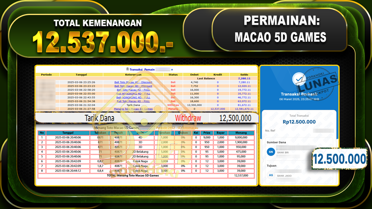 Bukti JP TOGEL 5D TOTOMACAU – ucapkan selamat kepada user id Lamxxx atas kemenangan di TOGEL 5D TOTOMACAU dengan total kemenangan Rp.12.537.000,- . Yang pasti nya langsung LUNAS sesuai bukti ya bosku. Dorahoki nih bosku berapapun akan tetap kami bayar lunas ya bosku.