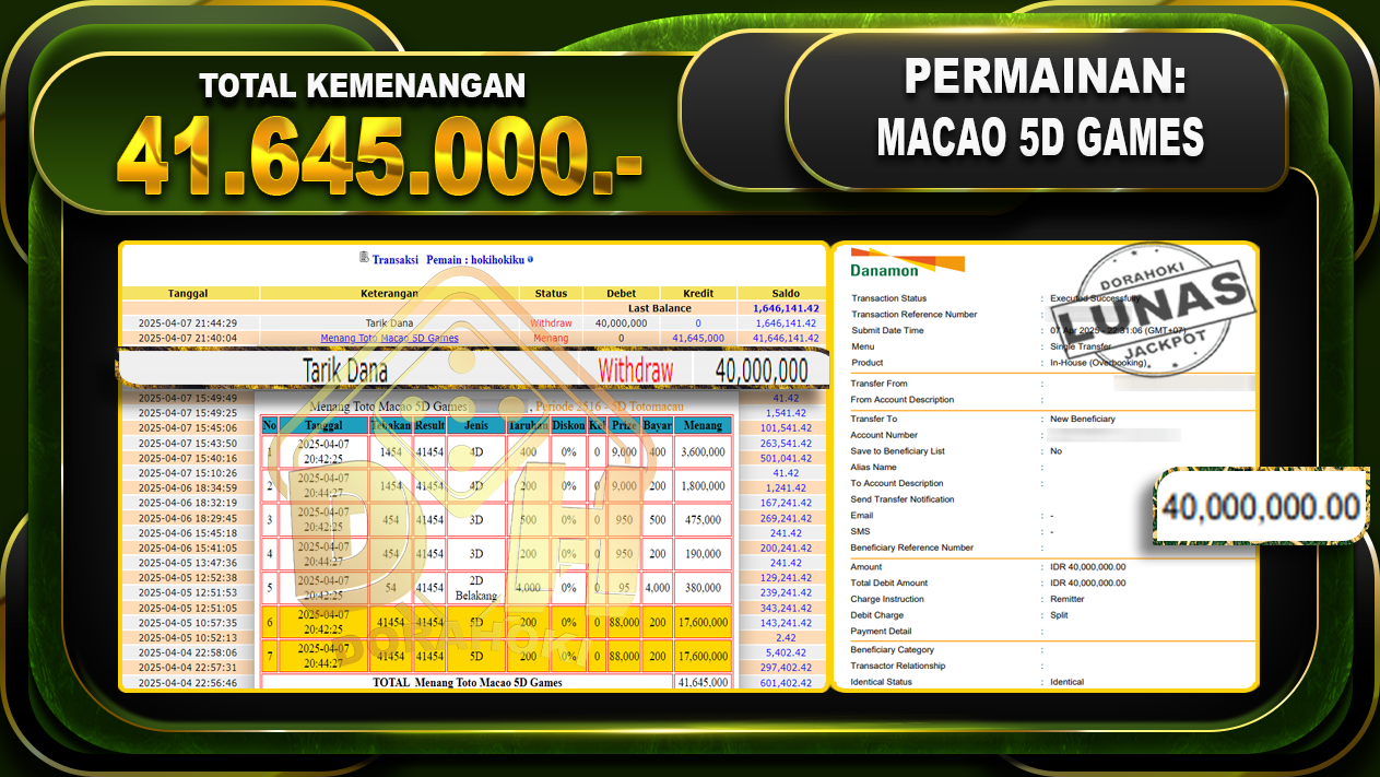 Bukti JP TOGEL 5D TOTOMACAU – ucapkan selamat kepada user id Hokxxx atas kemenangan di TOGEL 5D TOTOMACAU dengan total kemenangan Rp.41.645.000,- . Yang pasti nya langsung LUNAS sesuai bukti ya bosku. Dorahoki nih bosku berapapun akan tetap kami bayar lunas ya bosku.