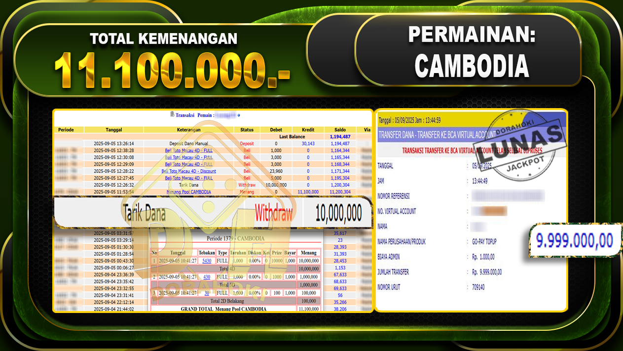 Bukti JP TOGEL CAMBODIA – ucapkan selamat kepada user id Locxxxxxx atas kemenangan di  TOGEL CAMBODIA dengan total kemenangan Rp.11,100,000,- Yang pasti nya langsung LUNAS sesuai bukti ya bosku. Dorahoki nih bosku berapapun akan tetap kami bayar lunas ya bosku