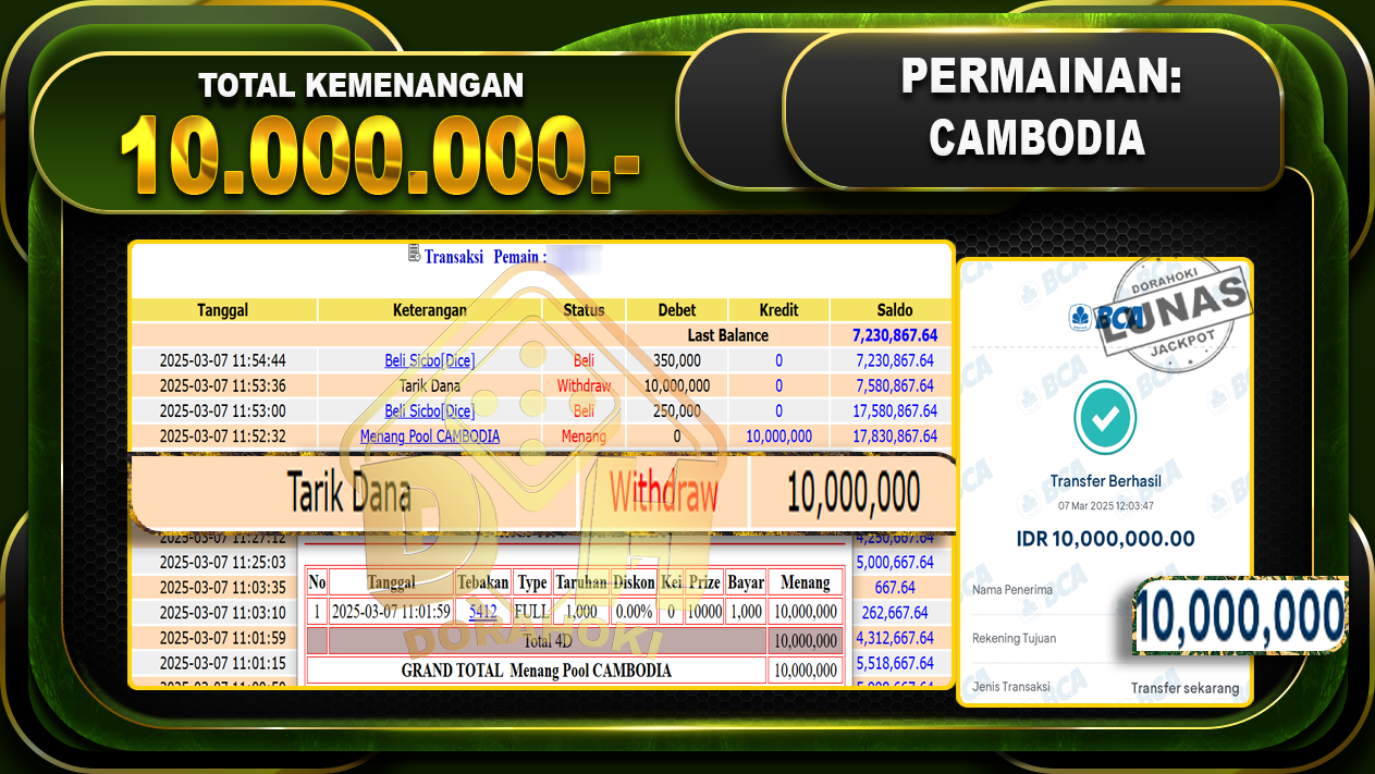 Bukti JP TOGEL CAMBODIA – ucapkan selamat kepada user id Gapxxx atas kemenangan di TOGEL CAMBODIA dengan total kemenangan Rp.10.000.000,- . Yang pasti nya langsung LUNAS sesuai bukti ya bosku. Dorahoki nih bosku berapapun akan tetap kami bayar lunas ya bosku.