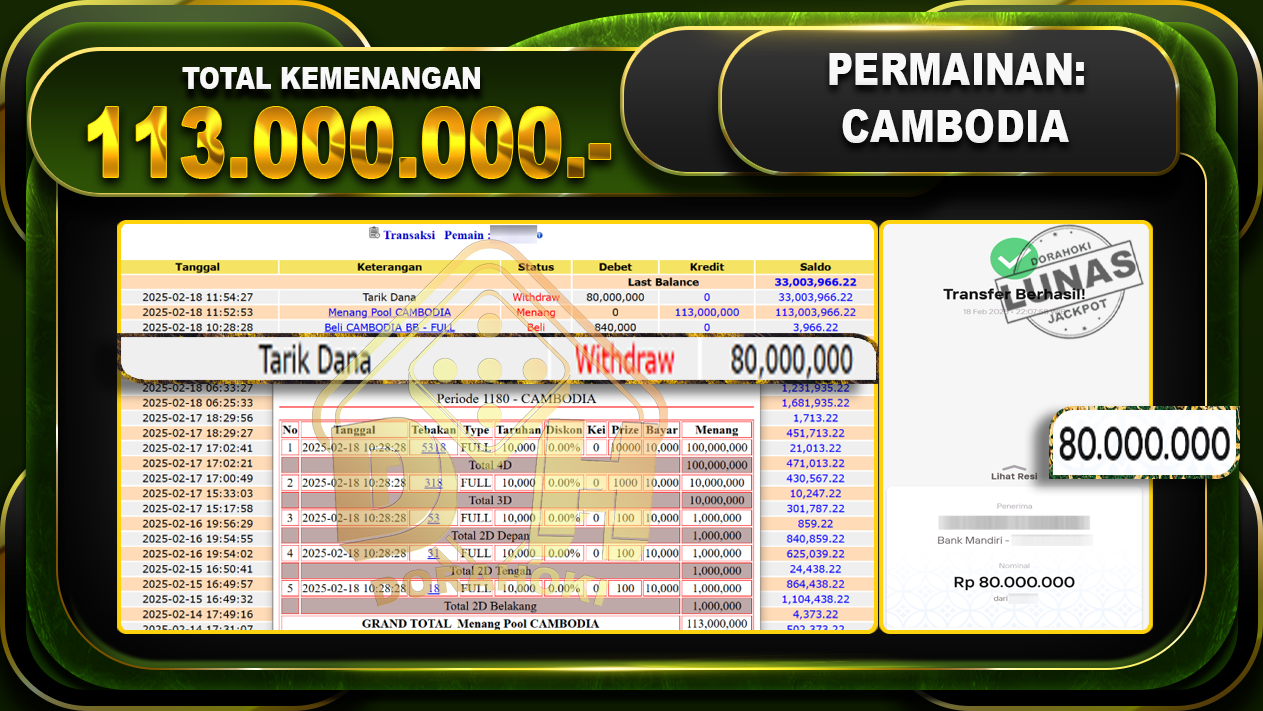 Bukti JP TOGEL CAMBODIA – Yang kami berikan ini sah dan real tanpa di rekayasa bosku dan hanya bertujuan untuk meningkatkan kepercayaan member kami dan memberikan kenyamanan saat bermain jadi bosku tidak perlu khawatir MENANG BERAPAPUN PASTI KAMI BAYAR LUNAS!!
