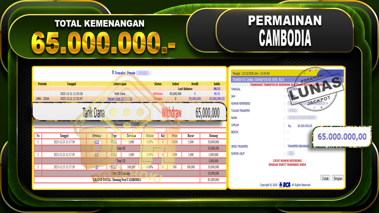 Bukti JP TOGEL CAMBODIA – ucapkan selamat kepada user id badxxx atas kemenangan di TOGEL CAMBODIA dengan total kemenangan Rp.65.000.000,- Yang pasti nya langsung LUNAS sesuai bukti ya bosku. Dorahoki nih bosku berapapun akan tetap kami bayar lunas ya bosku