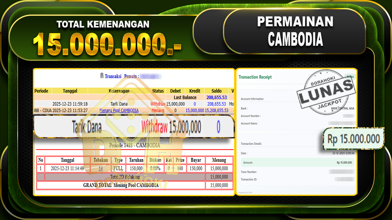 Bukti JP TOGEL CAMBODIA – ucapkan selamat kepada user id badxxx atas kemenangan di TOGEL CAMBODIA dengan total kemenangan Rp.15.000.000,- Yang pasti nya langsung LUNAS sesuai bukti ya bosku. Dorahoki nih bosku berapapun akan tetap kami bayar lunas ya bosku