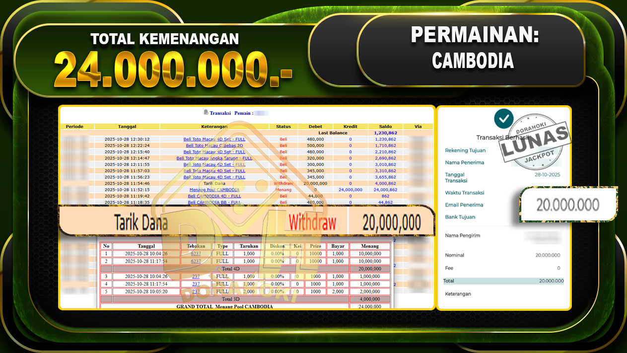 Bukti JP TOGEL CAMBODIA – ucapkan selamat kepada user id otixx atas kemenangan di TOGEL CAMBODIA dengan total kemenangan Rp.24,000,000,- Yang pasti nya langsung LUNAS sesuai bukti ya bosku. Dorahoki nih bosku berapapun akan tetap kami bayar lunas ya bosku