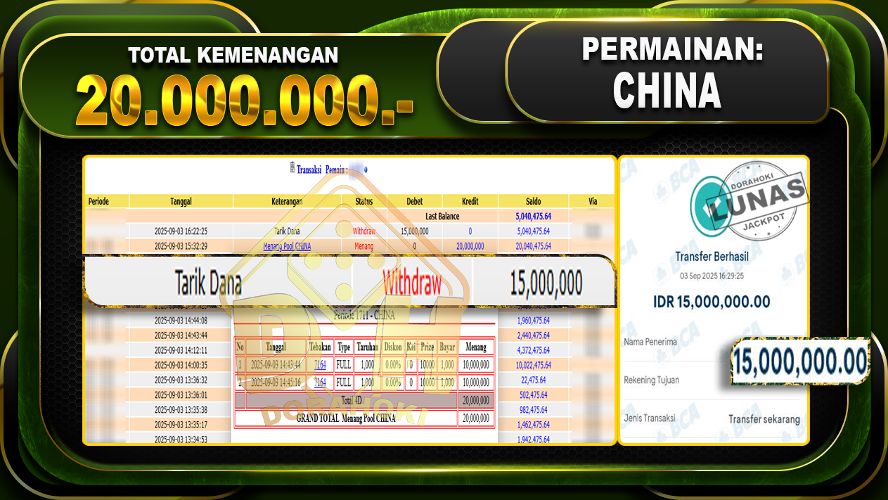 Bukti JP TOGEL CHINA – ucapkan selamat kepada user id Gapxxx atas kemenangan di TOGEL CHINA dengan total kemenangan Rp.20.000.000,- Yang pasti nya langsung LUNAS sesuai bukti ya bosku. Dorahoki nih bosku berapapun akan tetap kami bayar lunas ya bosku