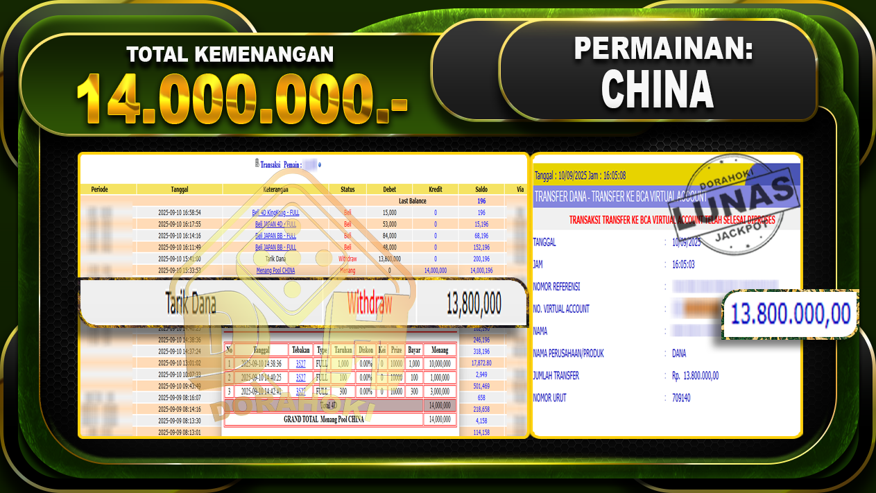 Bukti JP TOGEL CHINA – ucapkan selamat kepada user id Soxxxx atas kemenangan di TOGEL CHINA dengan total kemenangan Rp.14.000.000,- Yang pasti nya langsung LUNAS sesuai bukti ya bosku. Dorahoki nih bosku berapapun akan tetap kami bayar lunas ya bosku