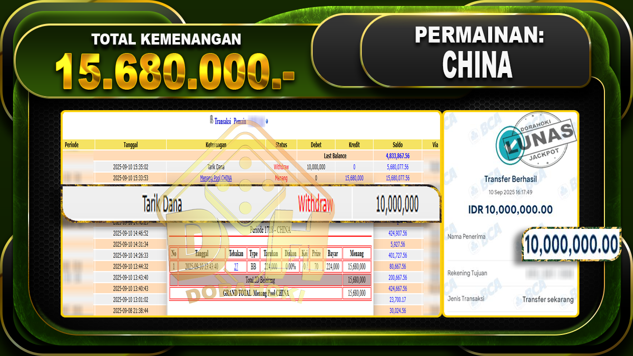 Bukti JP TOGEL CHINA – ucapkan selamat kepada user id Hoxxxxx atas kemenangan di  TOGEL CHINA dengan total kemenangan Rp.15.680.000,- Yang pasti nya langsung LUNAS sesuai bukti ya bosku. Dorahoki nih bosku berapapun akan tetap kami bayar lunas ya bosku