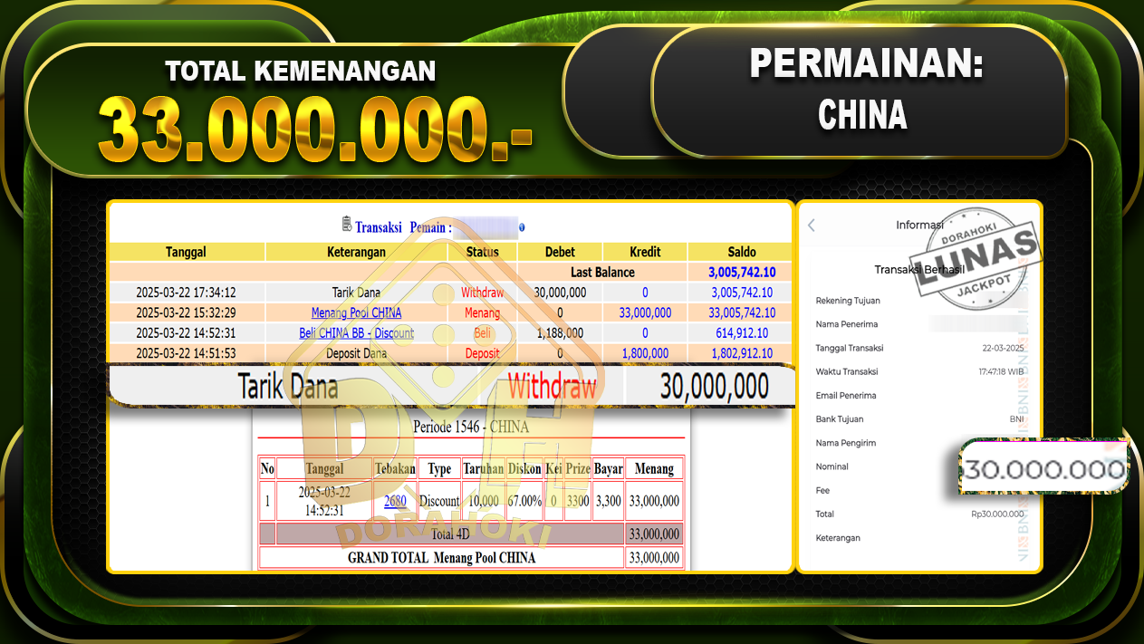 Bukti JP TOGEL CHINA – ucapkan selamat kepada user id Kupxxx atas kemenangan di  TOGEL CHINA  dengan total kemenangan Rp.33.000.000,- . Yang pasti nya langsung LUNAS sesuai bukti ya bosku. Dorahoki nih bosku berapapun akan tetap kami bayar lunas ya bosku.