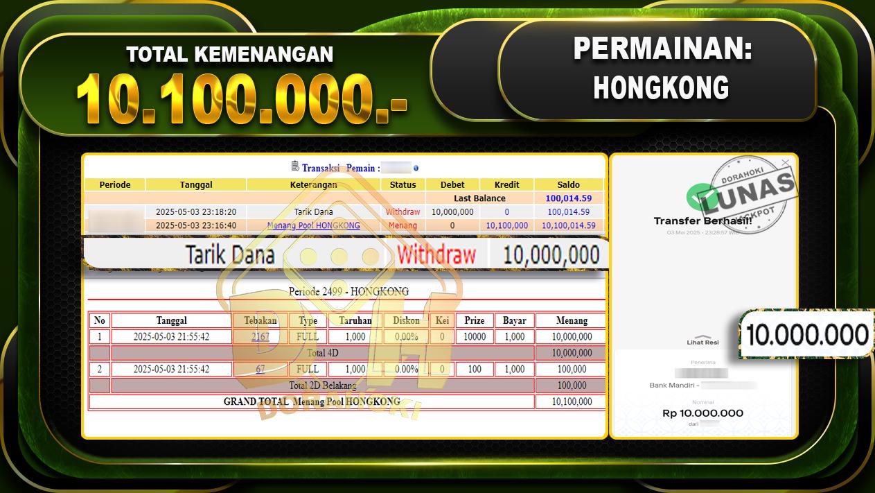 Bukti JP TOGEL HONGKONG – ucapkan selamat kepada user id Busxxx atas kemenangan di TOGEL HONGKONG dengan total kemenangan Rp 10.000.000,- . Yang pasti nya langsung LUNAS sesuai bukti ya bosku. Dorahoki nih bosku berapapun akan tetap kami bayar lunas ya bosku.