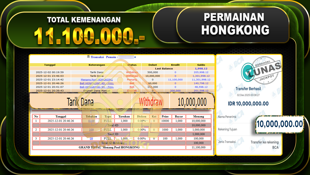 Bukti JP TOGEL HONGKONG – ucapkan selamat kepada user id bmmxxxx atas kemenangan di TOGEL HONGKONG dengan total kemenangan Rp.11,100,000,- . Yang pasti nya langsung LUNAS sesuai bukti ya bosku. Dorahoki nih bosku berapapun akan tetap kami bayar lunas ya bosku.