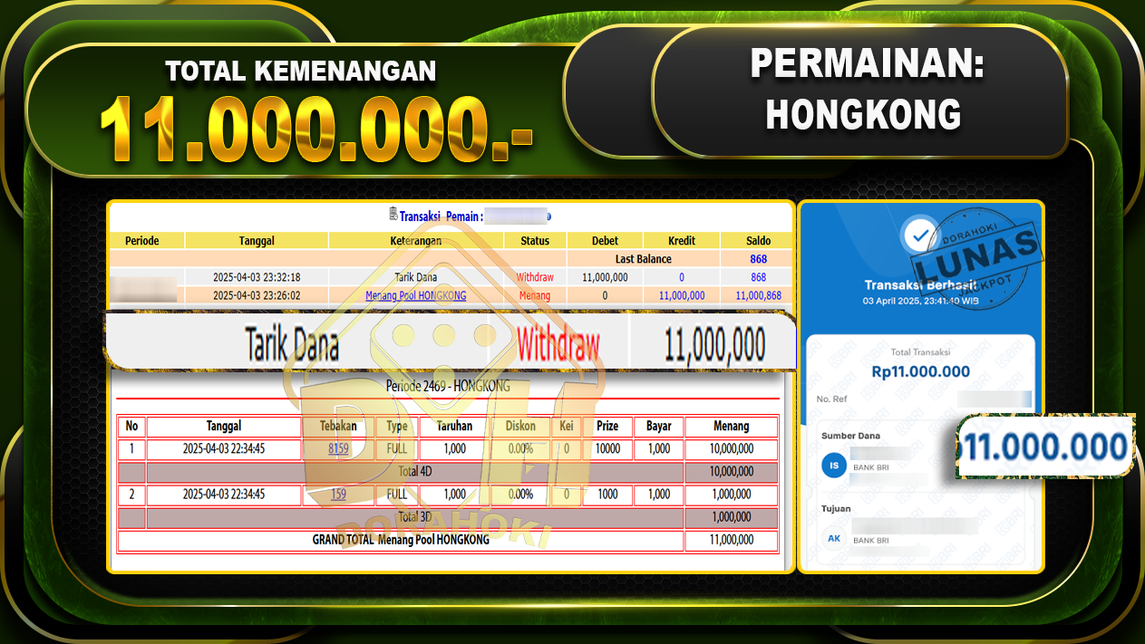Bukti JP TOGEL HONGKONG – ucapkan selamat kepada user id Arkxxx atas kemenangan di TOGEL HONGKONG dengan total kemenangan Rp11.000.000,- . Yang pasti nya langsung LUNAS sesuai bukti ya bosku. Dorahoki nih bosku berapapun akan tetap kami bayar lunas ya bosku.