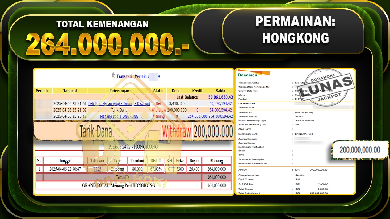 Bukti JP TOGEL HONGKONG – ucapkan selamat kepada user id Jitxxx atas kemenangan di TOGEL HONGKONG dengan total kemenangan Rp264.000.000,- . Yang pasti nya langsung LUNAS sesuai bukti ya bosku. Dorahoki nih bosku berapapun akan tetap kami bayar lunas ya bosku.