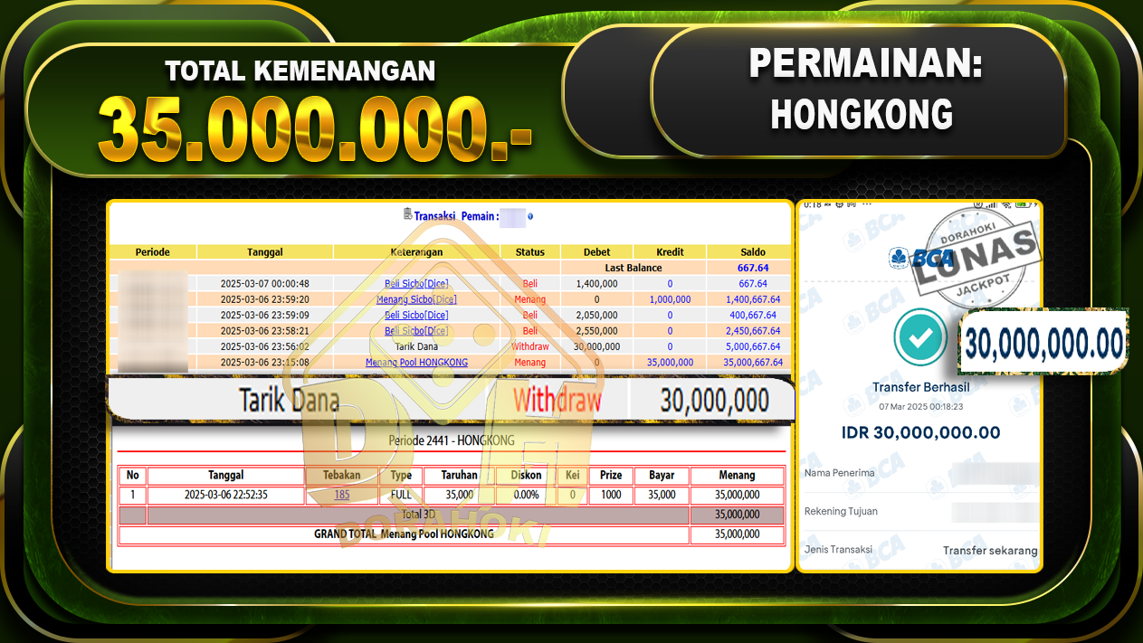 Bukti JP TOGEL HONGKONG – ucapkan selamat kepada user id Gapxxx atas kemenangan di TOGEL HONGKONG dengan total kemenangan Rp.35.000.000,- . Yang pasti nya langsung LUNAS sesuai bukti ya bosku. Dorahoki nih bosku berapapun akan tetap kami bayar lunas ya bosku.